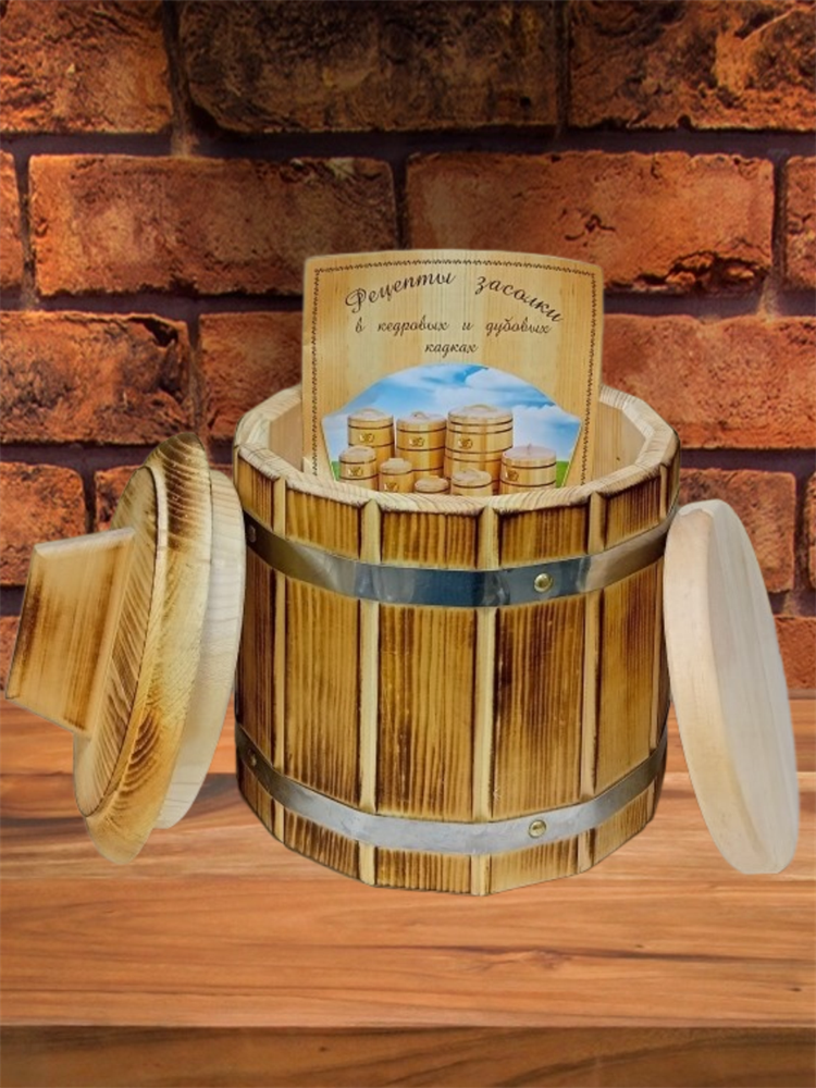 Изделие представляет собой небольшую деревянную емкость в форме усеченного конуса. Объем кадки – 10 литров. Изготовлена кадка ручным способом, из прямых клепок, сжатых обручами из нержавеющей стали, без применения клея и лаков. Изделие обработано натуральным воском. В комплекте с кадкой идут деревянный гнет и съемная крышка. Изделие может быть подвергнуто специальной обработке под старение, придающей красивую фактурность рельефу древесины. Используется кадка для засолки, квашения, мочения. Небольшой объем позволяет применять кадку для хранения меда или сыпучих продуктов.