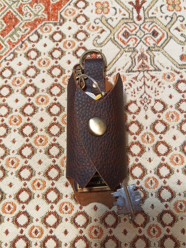 Закрывается ключница на кнопку, внутри большое кольцо для ключей.